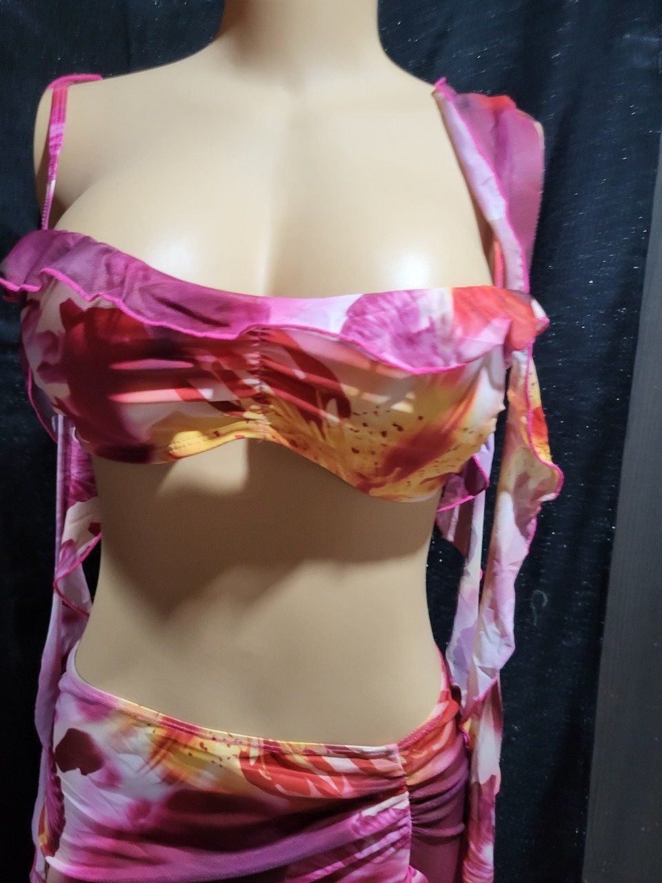 Un ensemble féminin composé d’un maillot de bain deux pièces et d’une jupe longue assortie. Son imprimé floral aux tons roses apporte une touche tropicale élégante.