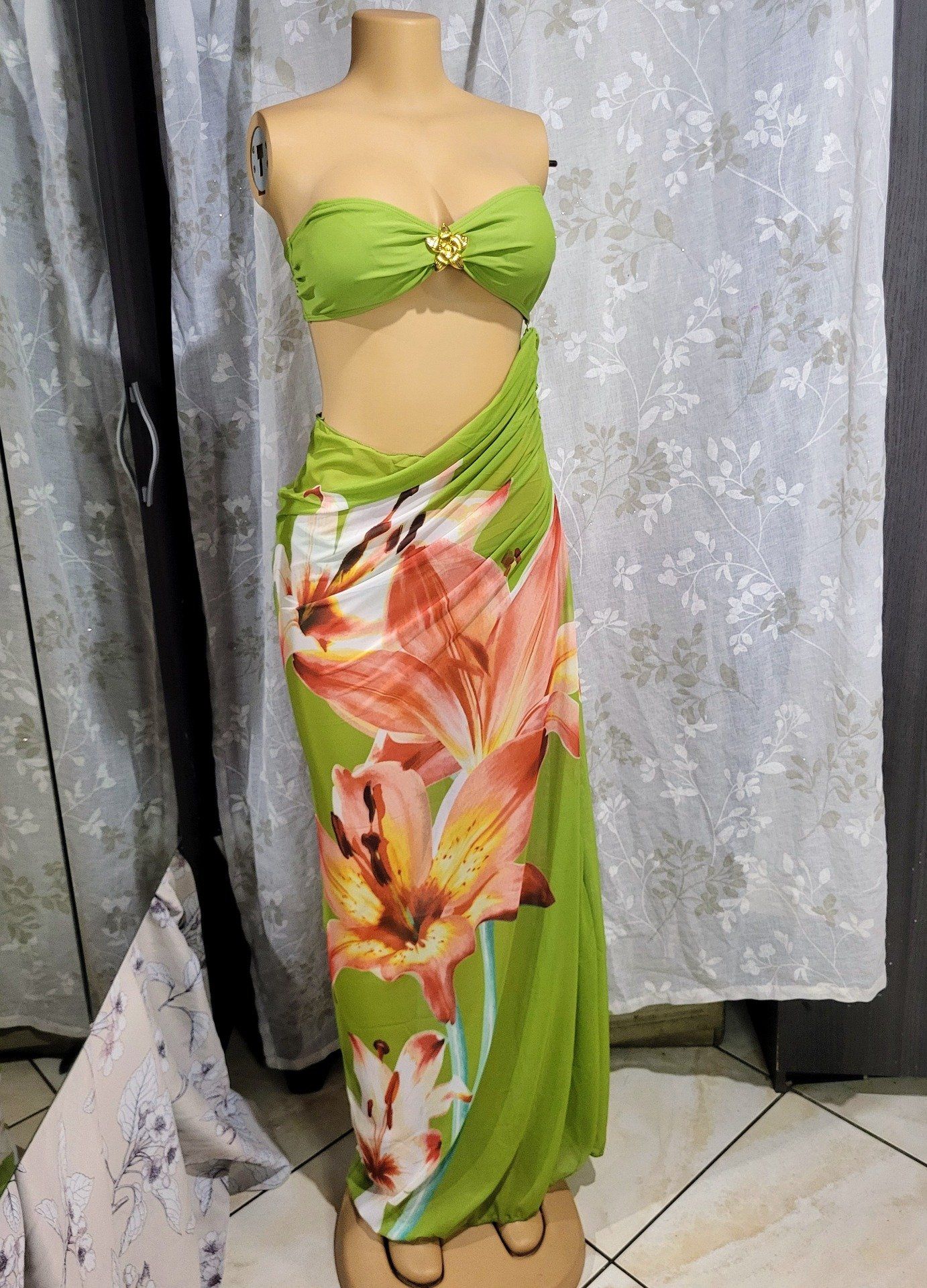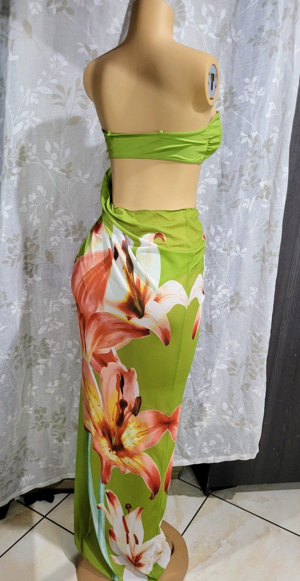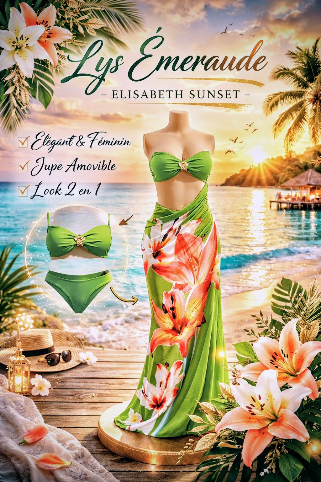 Ensemble Lys Émeraude composé d’un maillot de bain vert sublimé par un bijou floral et d’une jupe longue tropicale amovible qui s’attache au maillot. Une tenue féminine, élégante et exotique, parfaite pour la plage et les soirées d’été.