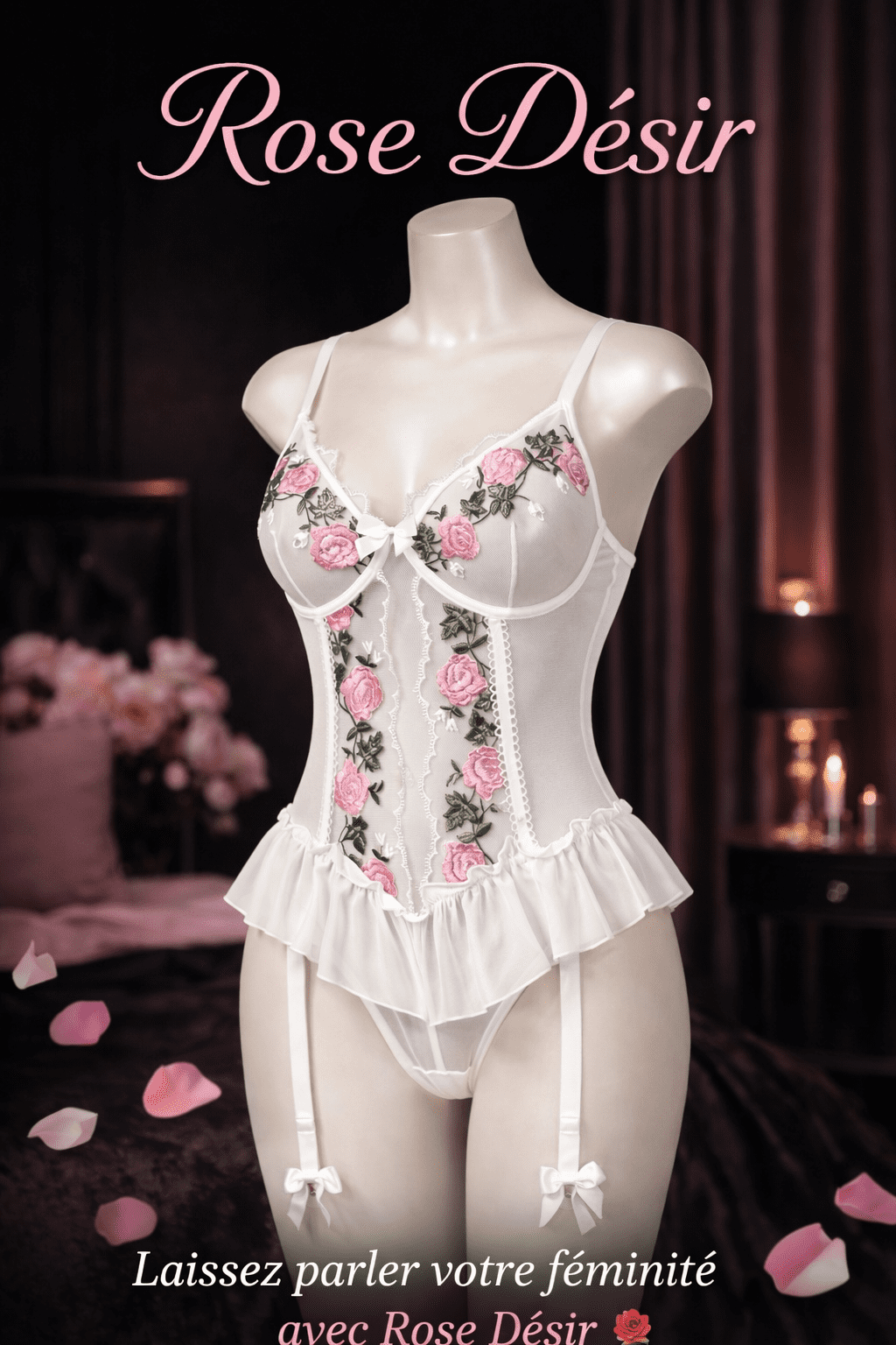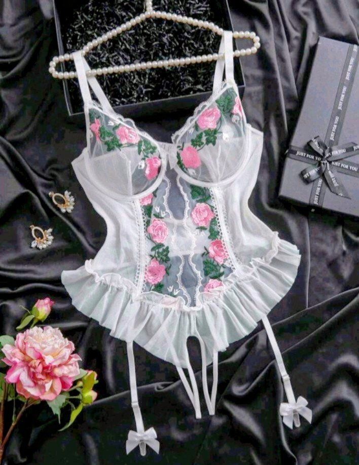 Un body en dentelle florale délicate, alliant douceur et sensualité. Rose Désir sublime la silhouette avec une touche élégante et féminine.